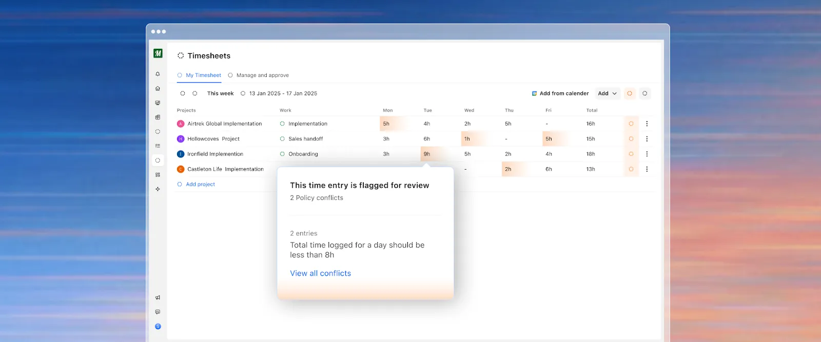 Timesheet Policies enforces the rules at the point of entry — minimum hours, mandatory notes, role-based logging, region-specific rules — all applied automatically, before anything reaches approvals or billing.