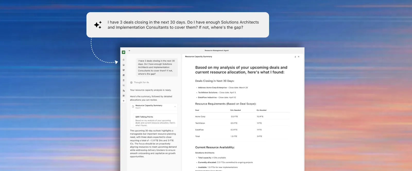 Resource Management Agent transforms resource allocation, capacity planning, and forecasting from manual spreadsheet work and scattered conversations into one intelligent conversational interface.