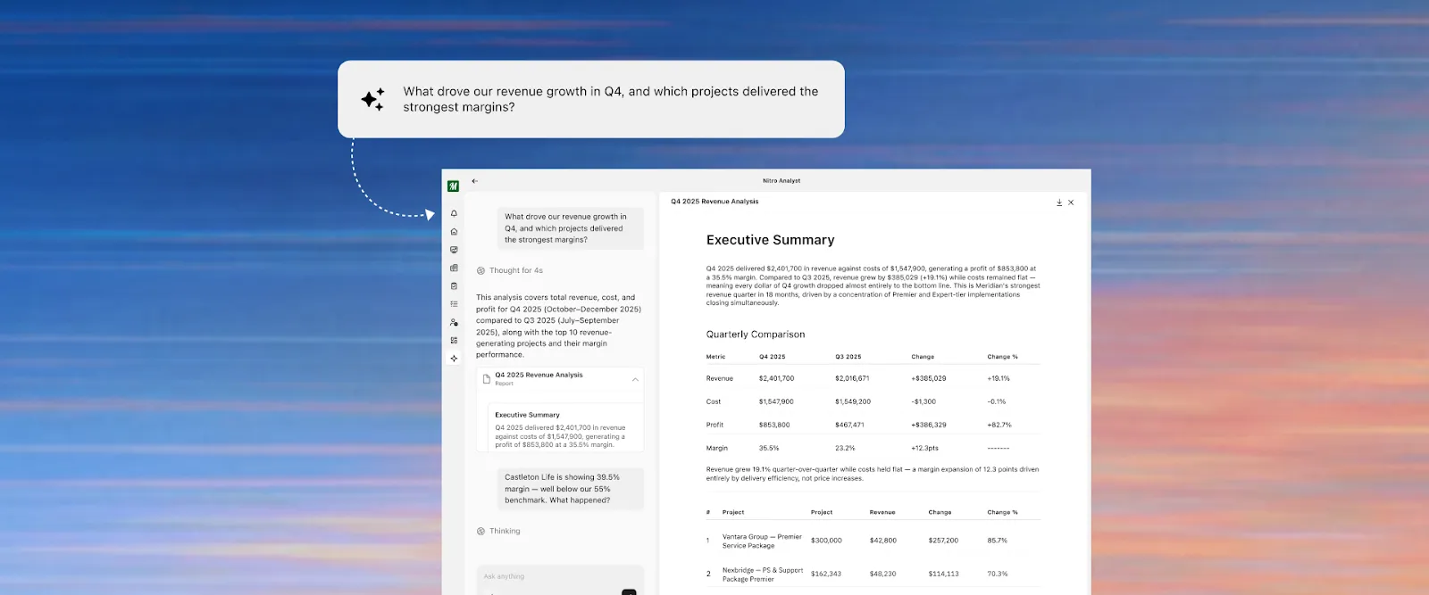 Nitro Analyst enables you to build a group of agentic analysts that creates executive-ready reports for you on revenue, margins, utilization, or any delivery metrics.