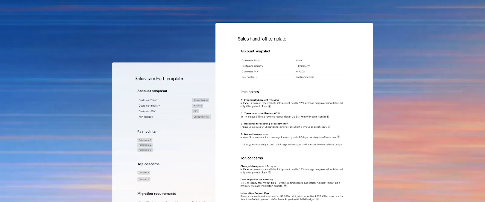 - Every statement is traceable back to the exact meeting or email it came from — if something wasn't discussed, it won't appear in the document. Unlike ChatGPT or Gong summaries, outputs are workflow-matched, template-driven, and usable — not just readable.