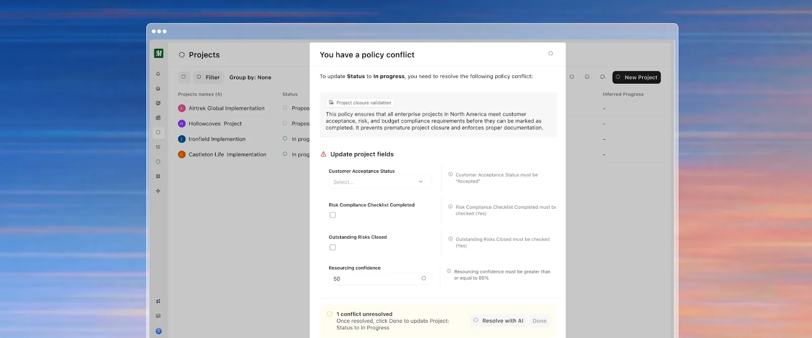 - Supports granular conditions: policies can apply by project type, region, role, or compliance level — so fixed-fee enterprise projects get strict controls while internal work gets lighter guardrails.