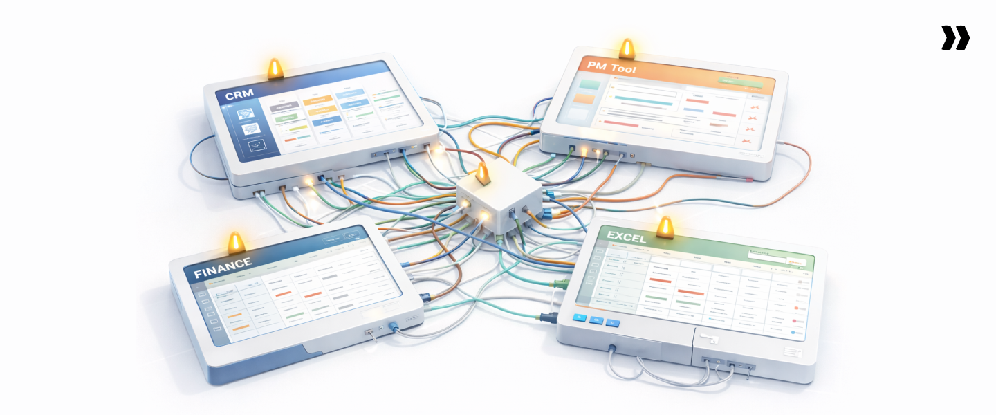 The result is what operations leaders consistently describe as the Frankenstein stack: Salesforce for pipeline, Jira for projects, Excel for resource planning, QuickBooks for billing, Slack for coordination, and email for client updates.