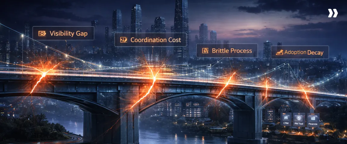 Project activity flows through multiple operational systems, including project management platforms, time tracking tools, financial systems, CRM pipelines, and resource planning software.