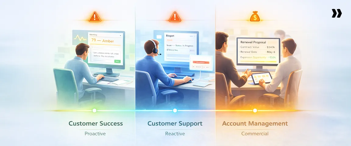 Customer success, customer support, and account management serve different functions in SaaS, even though they interact with the same customers.