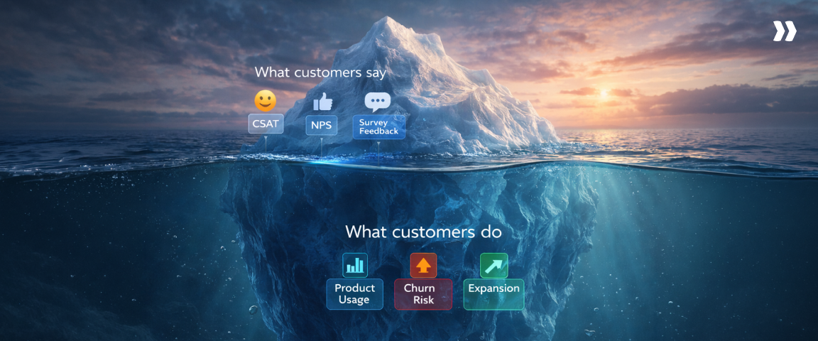 A customer can rate you highly in an NPS survey and still reduce usage. Another can report neutral satisfaction but expand their contract. Behavior removes ambiguity.