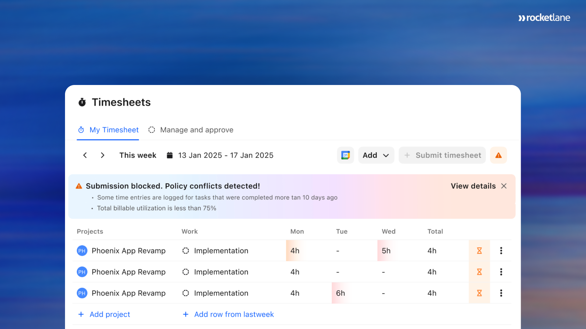 Weekend logs. Allocation overruns. Missing notes. Time logged against the wrong task. Flagged before they land in your queue. The entries that need your attention get it. The ones that don't, sail through.